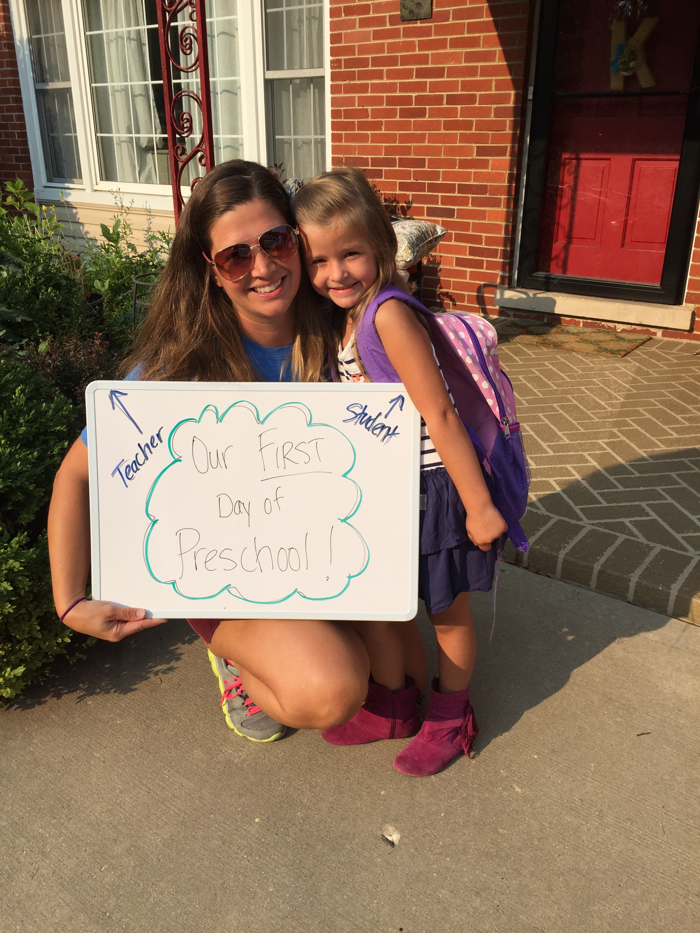 I’ll rewind, the night before preschool was to start she went to bed with her outfit picked out, new boots to wear, and a bow for her hair!! She got her backpack ready and went to sleep thinking about her friends and beloved teachers! When we woke up, the whole family rejoiced in her first day of preschool. We ate breakfast and took the obligatory first day of school pictures with her dad, me, her siblings, and my mom.