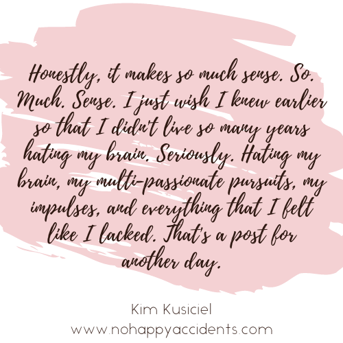 Yep. Surprise! I am the newest member to join the adult ADHD club. It’s a club that I never thought I would be a member of, but here I am. Honestly, it makes so much sense. So. Much. Sense. I just wish I knew earlier so that I didn’t live so many years hating my brain. Seriously. Hating my brain, my multi-passionate pursuits, my impulses, and everything that I felt like I lacked. That’s a post for another day. Sorry, I digress.