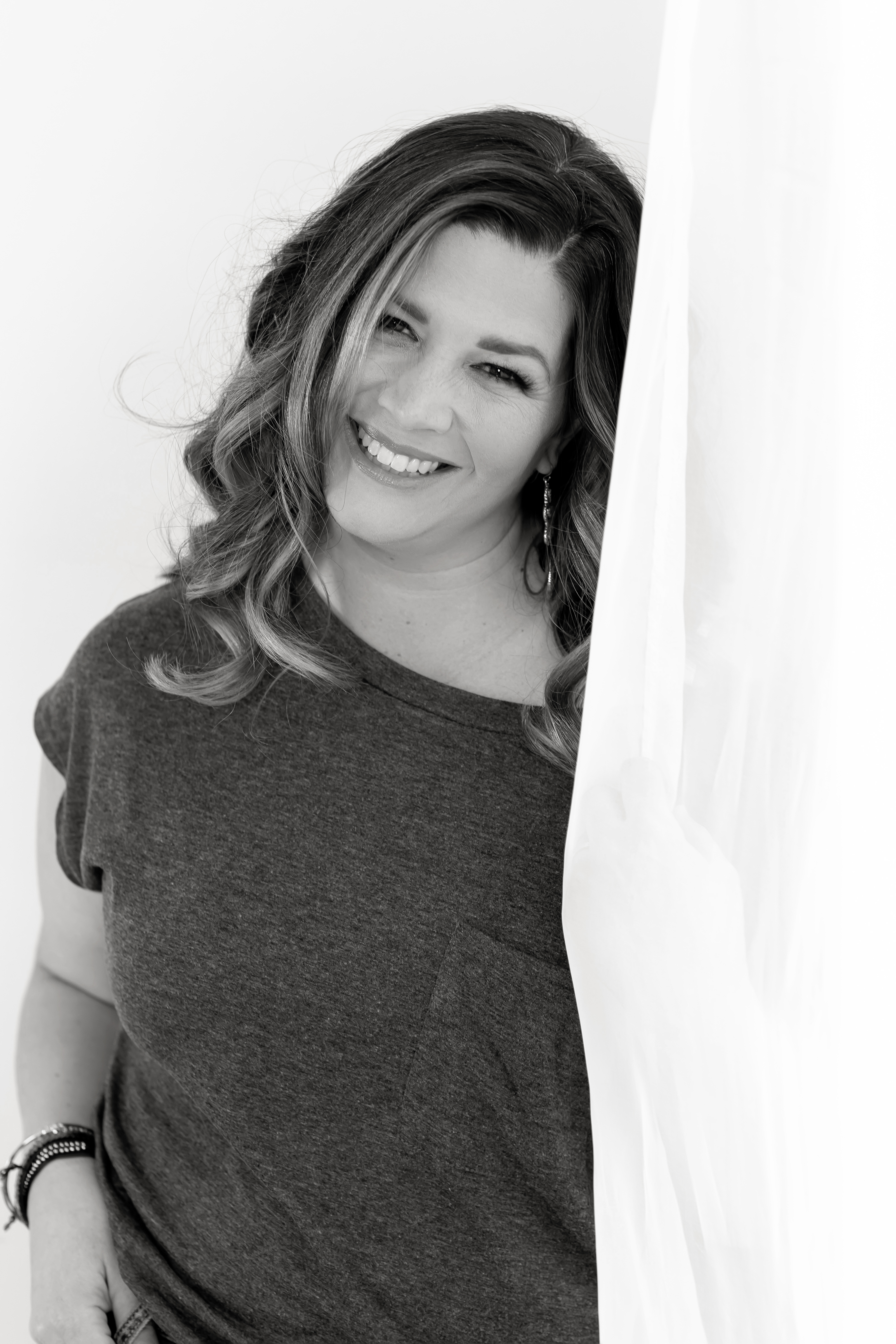 Kim standing in a gray shirt by a window. Photo credit: Something Blue Photography